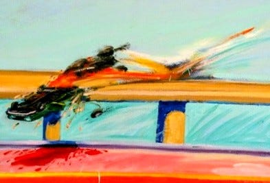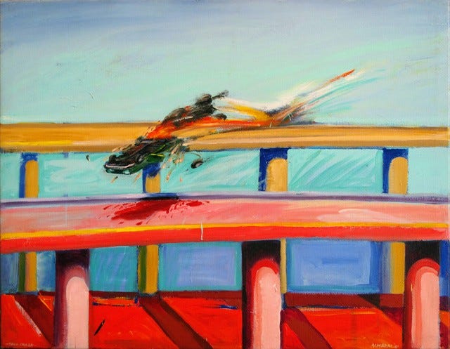 The first painting is by Carlos Almaraz: “Solo Crash.” Almaraz made a series of these “crash” paintings set on LA’s elevated highways. Each is violent and yet spectacularly beautiful.