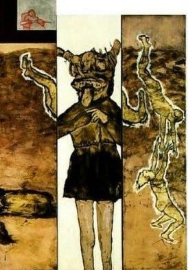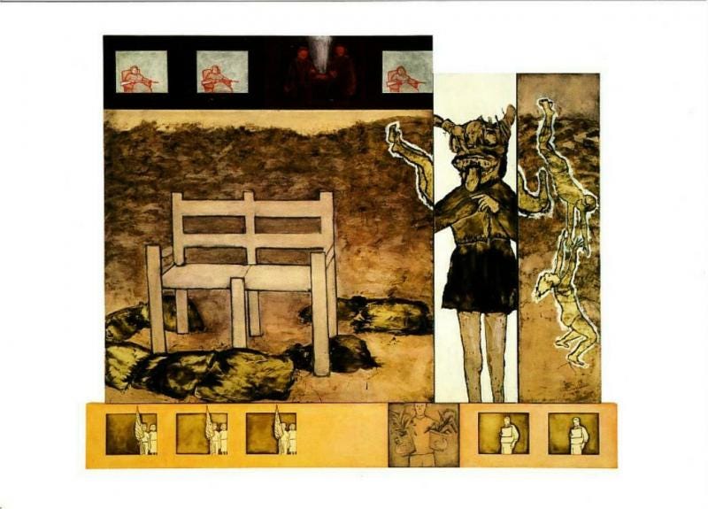 The next painting is “Chronic Hollow” by Ida Applebroog. It’s a multi-panel piece, a jigsaw puzzle. The artist notes in a separate caption that the inspiration for the painting was the execution of Julius and Ethel Rosenberg, but nothing in the image directly indicates this.