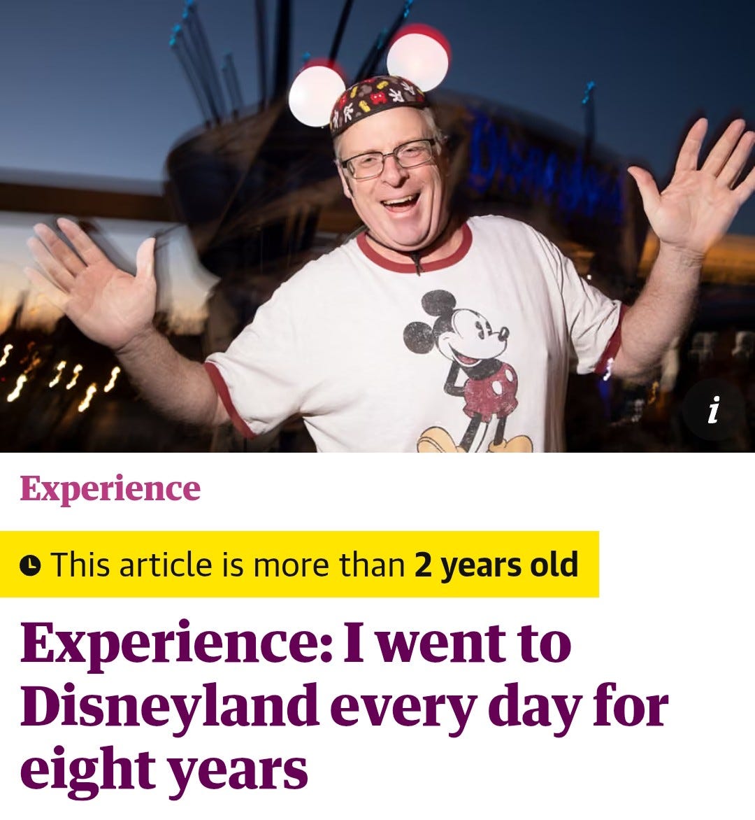 A Californian man visited Disneyland every day for 8 years. After his hospital shift ended at 3pm he’d go straight to the park. His run of 2,995 consecutive visits only ended when the pandemic shut the gates.